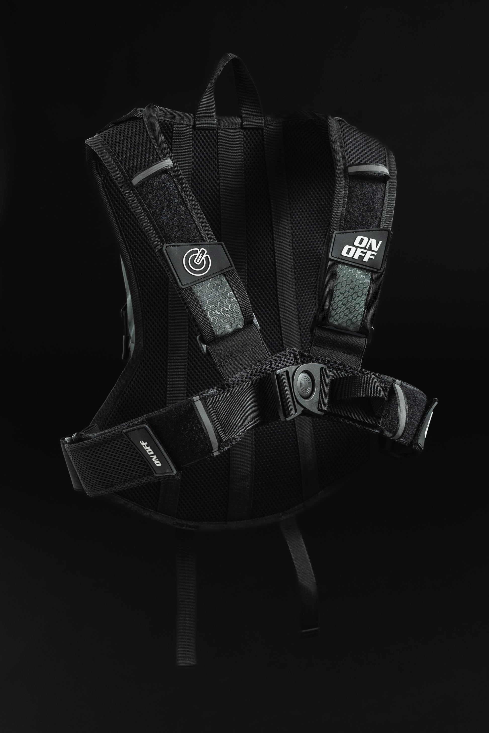 The compact and lightweight design , combined with the adjustable front closure , ensures a stable but not restrictive fit. The structure is designed to distribute weight evenly , leaving the chest free and ensuring total mobility while driving.